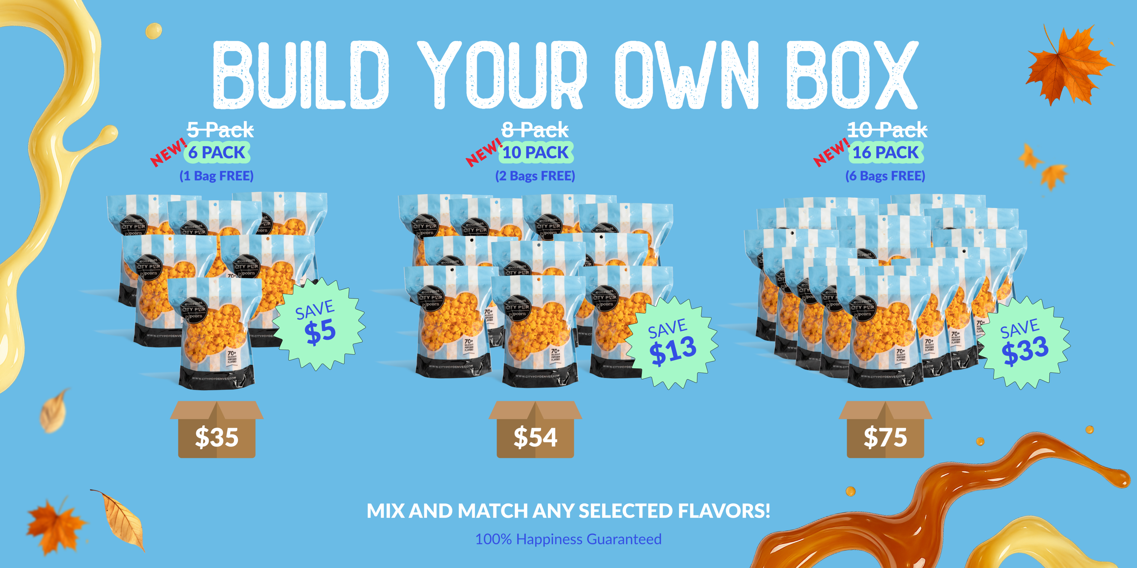 Mix and match our best-selling popcorn flavors in 6-cup resealable bags. Build your own 6, 10, or 16 bag bundle—perfect for gifts or snacking. The bigger the bundle, the more you save!